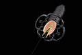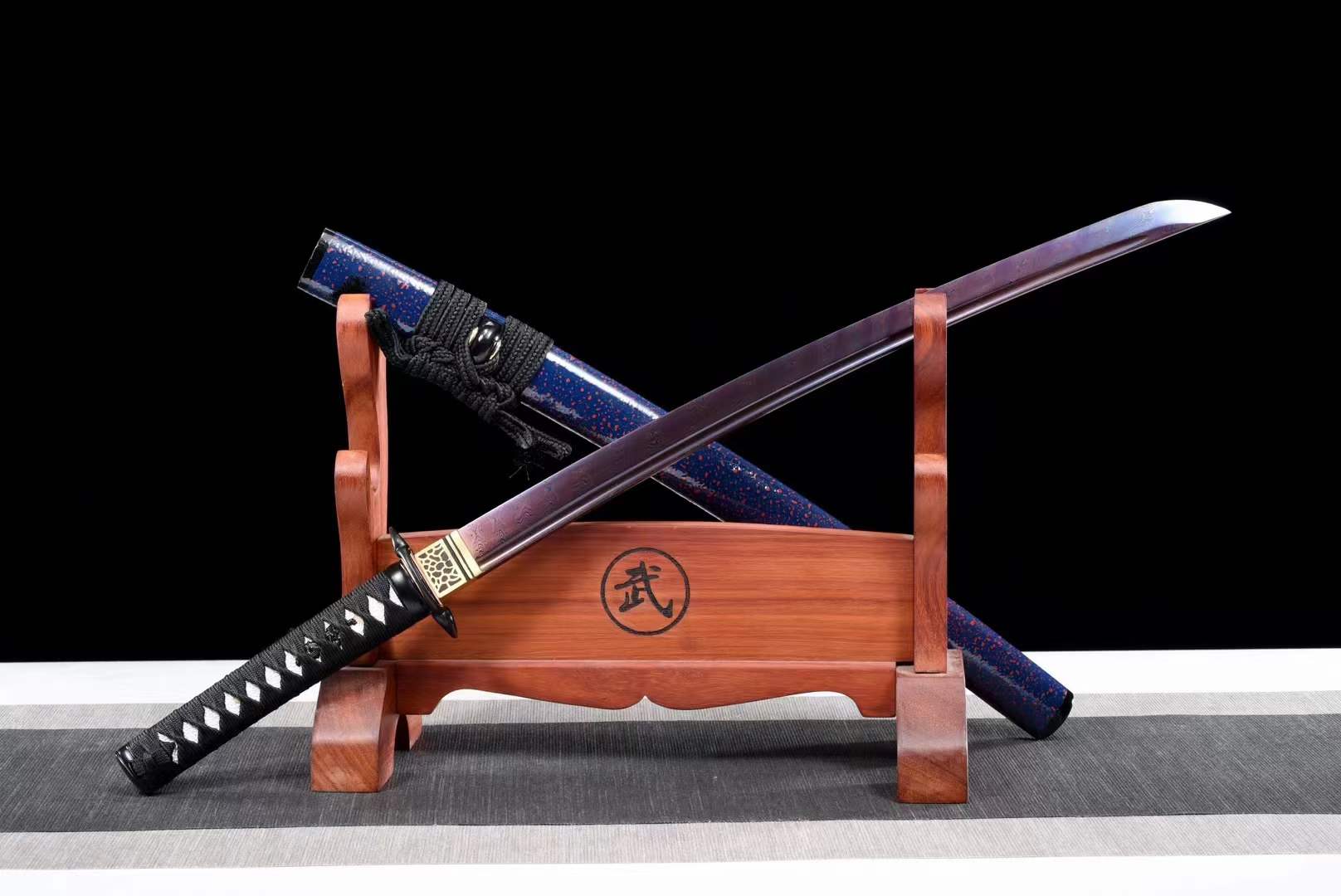 The blade is made of Damascus steel with baked blue twist pattern, with a hardness of 60°.