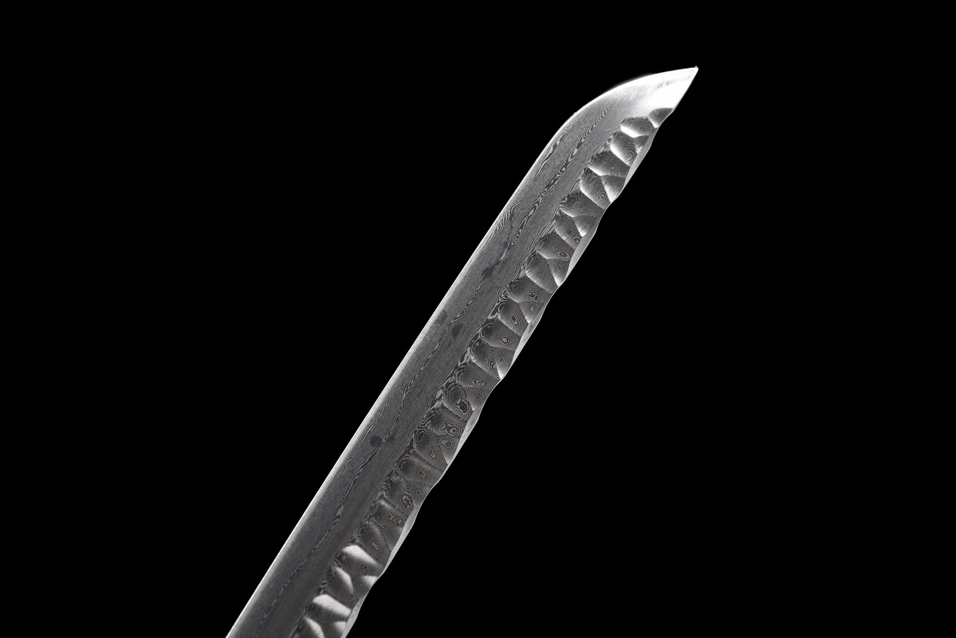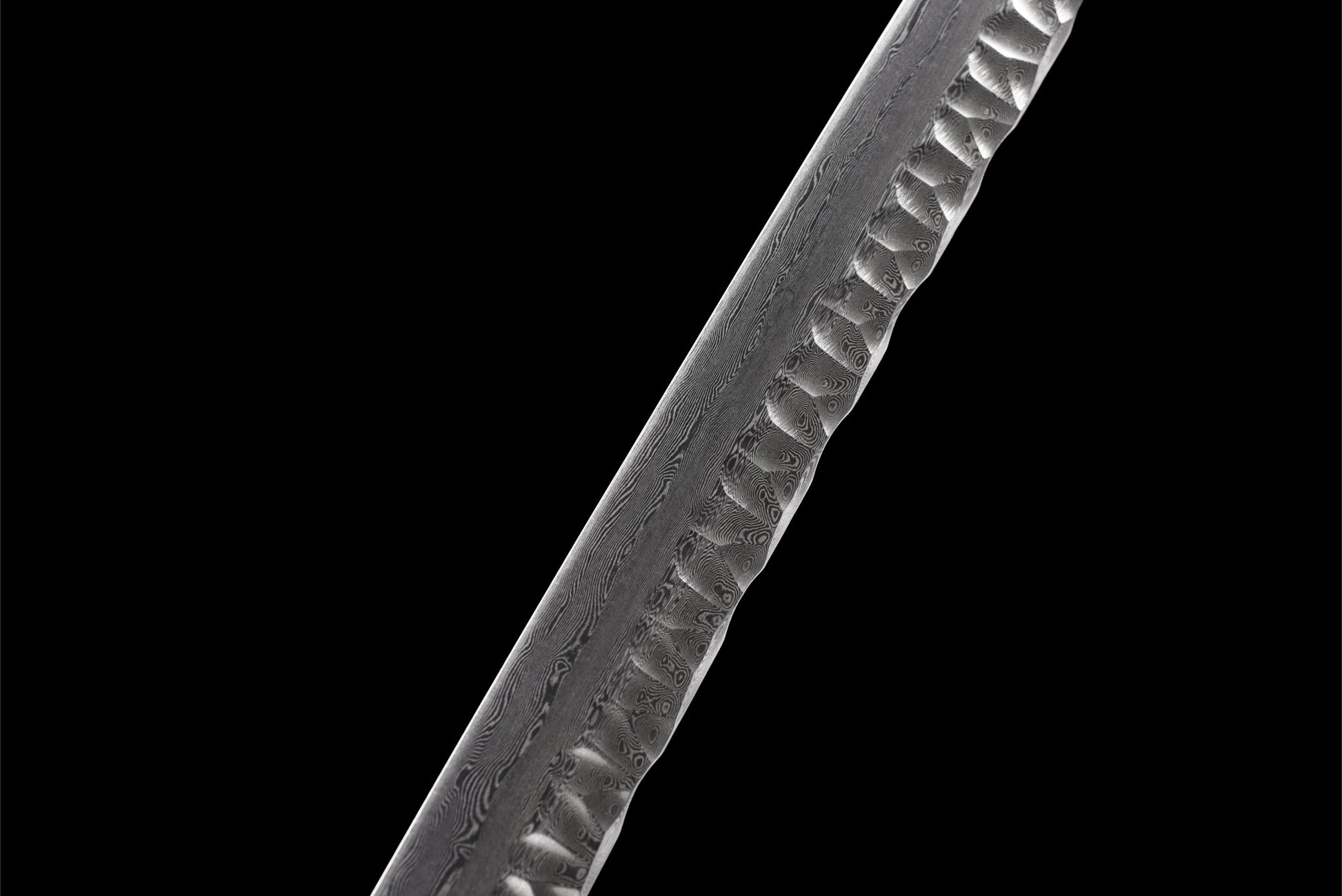 The 71 cm Damascus steel blade features a distinctly textured surface that attracts the eye and invites the touch. The blade's gray color contrasts with its unusual shape, designed to capture attention and spark conversation.