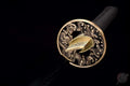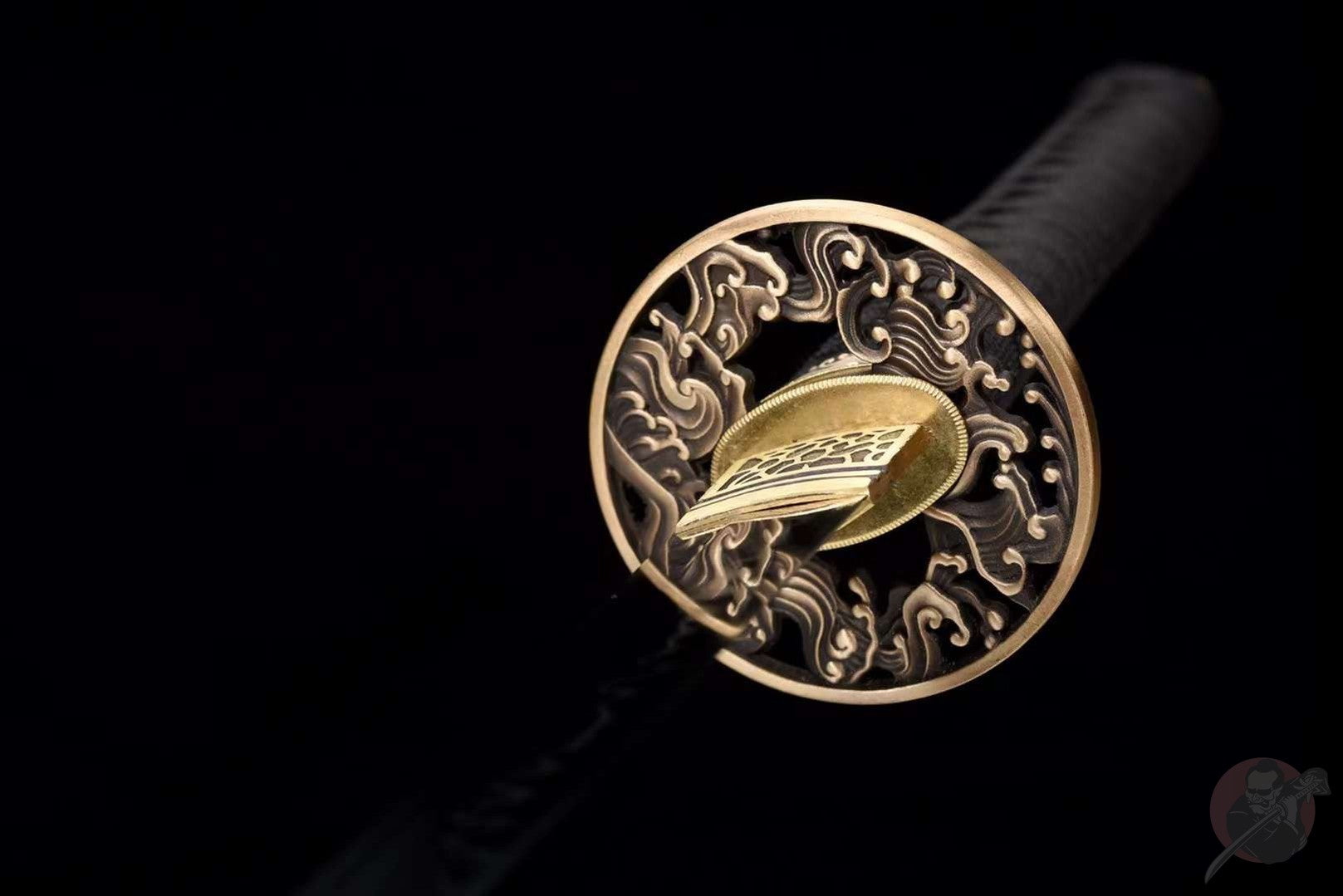 This Katana has a T10 steel blade with Hamon and mirror polish. The Tsuba is highly detailed in a solid brass carving that represents the Kanagawa wave.